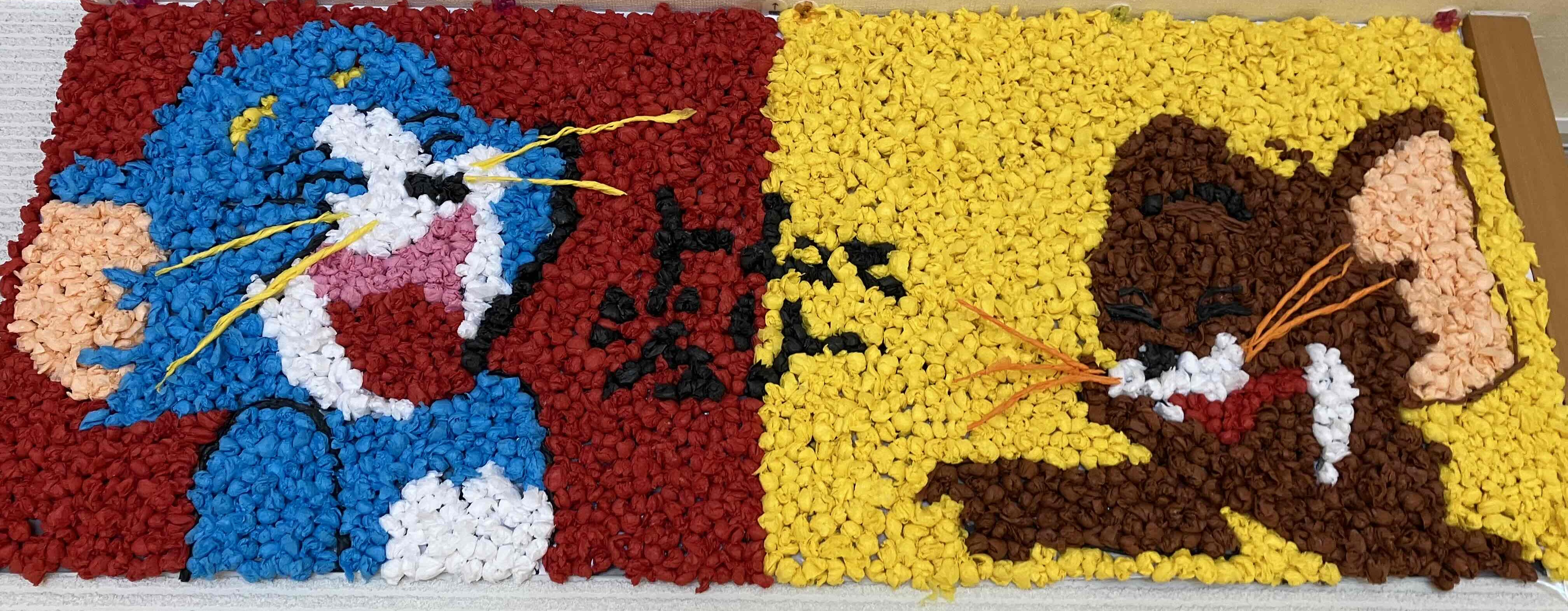 モザイク画は8色からなる折り紙を1×1㎝のサイズに切り、それらを色分けされた部分に貼っていく、すべてを合わせると一つの絵として完成する。