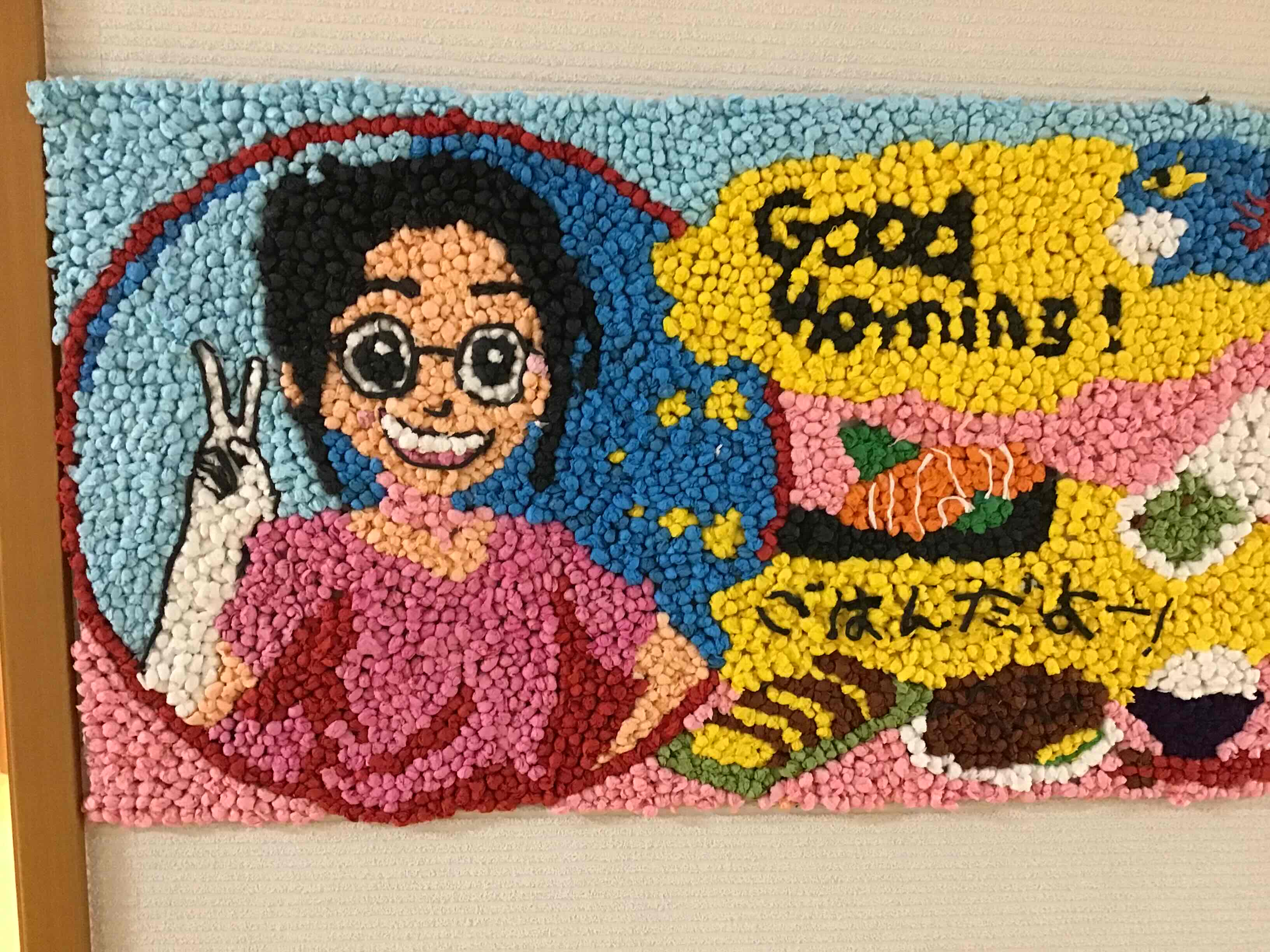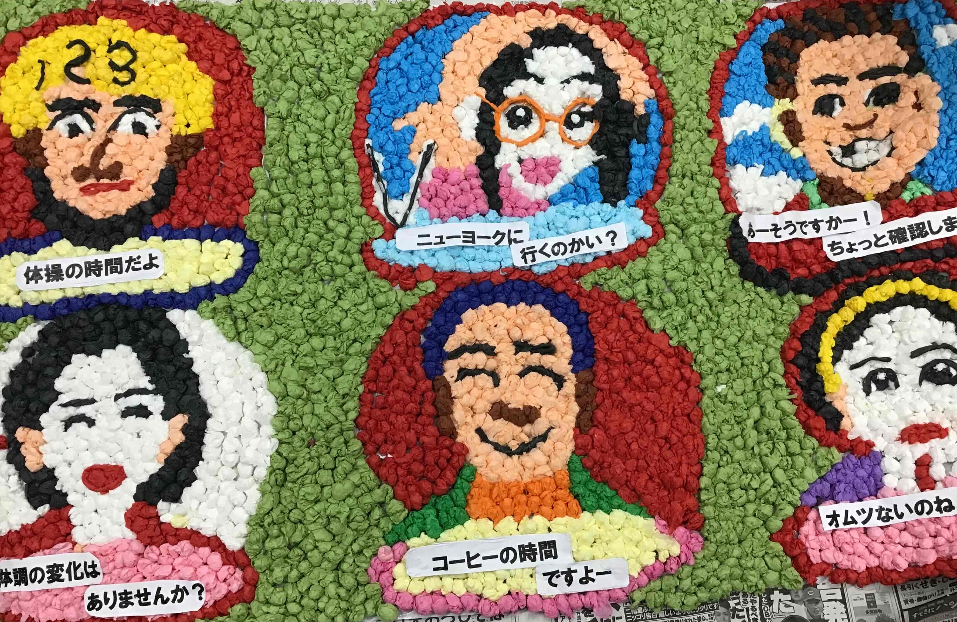 施設長の「ご飯だよー」という呼び声を、綺麗にお花紙で作ってもらい、入居者様から依頼のあったものを張り合わせて、作業してもらっています。