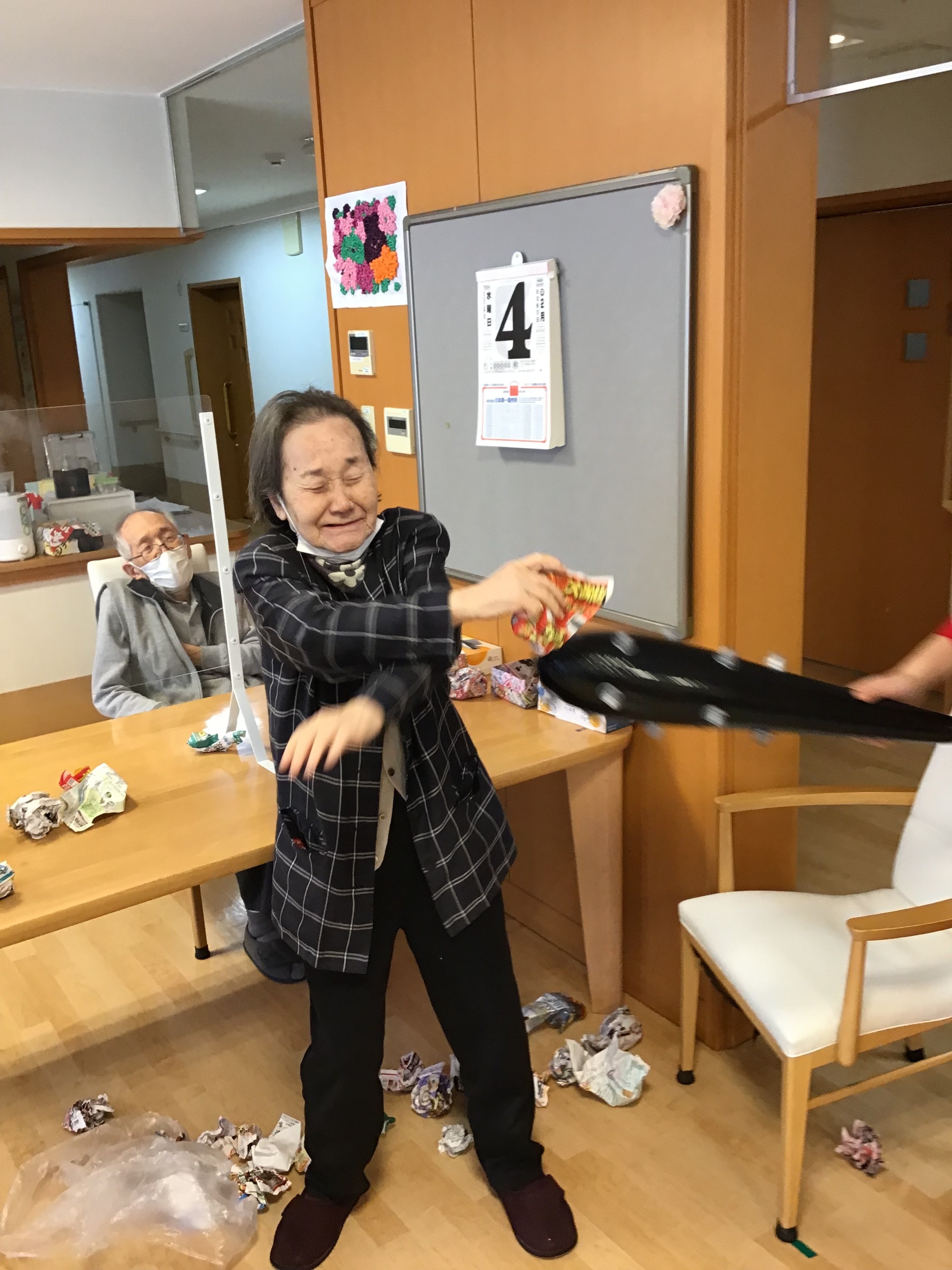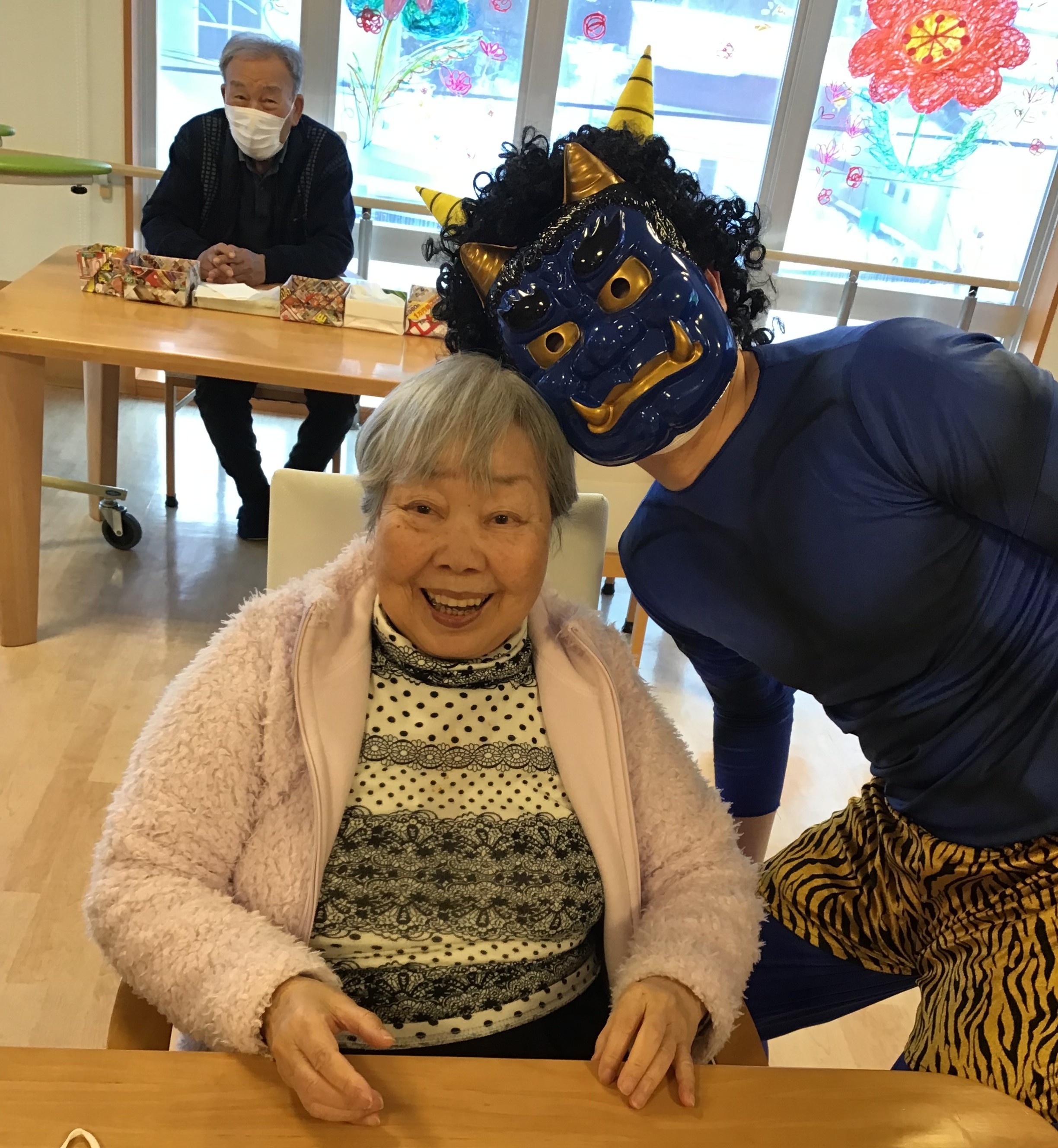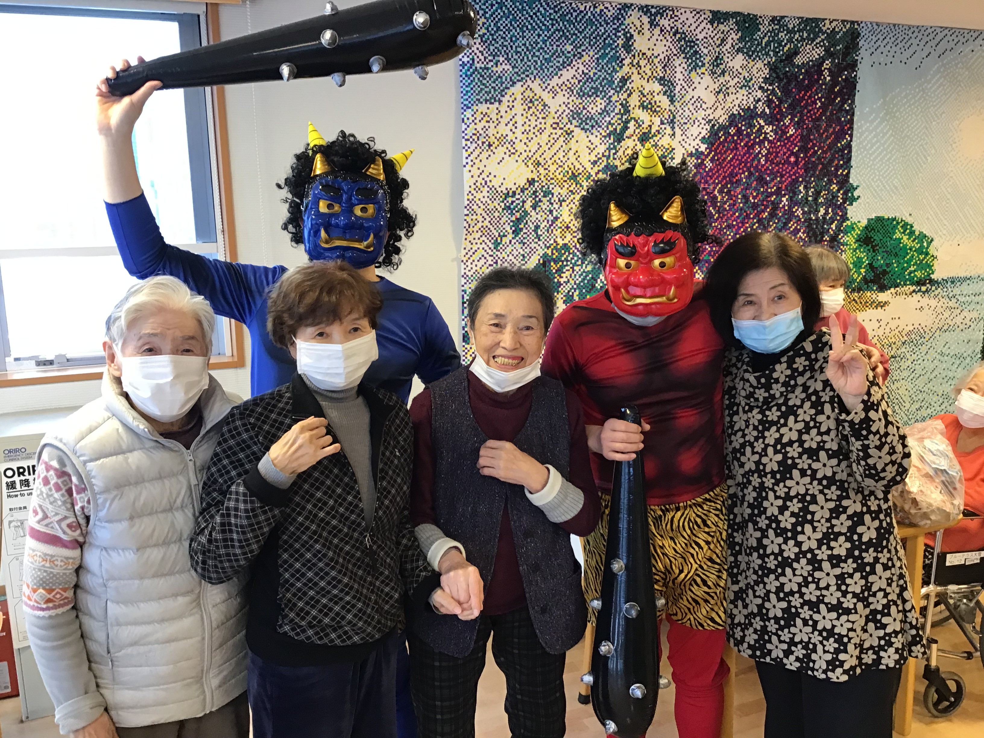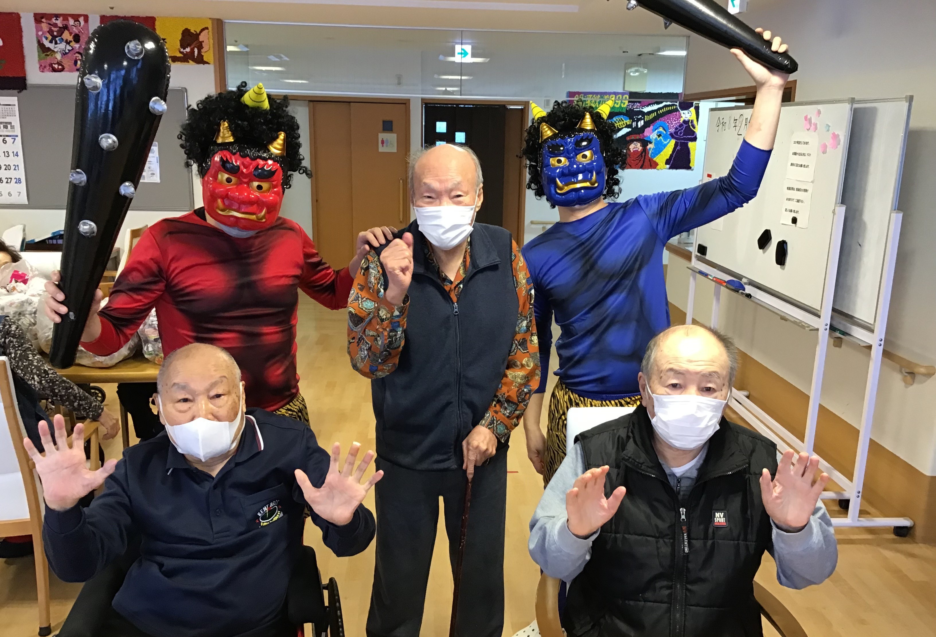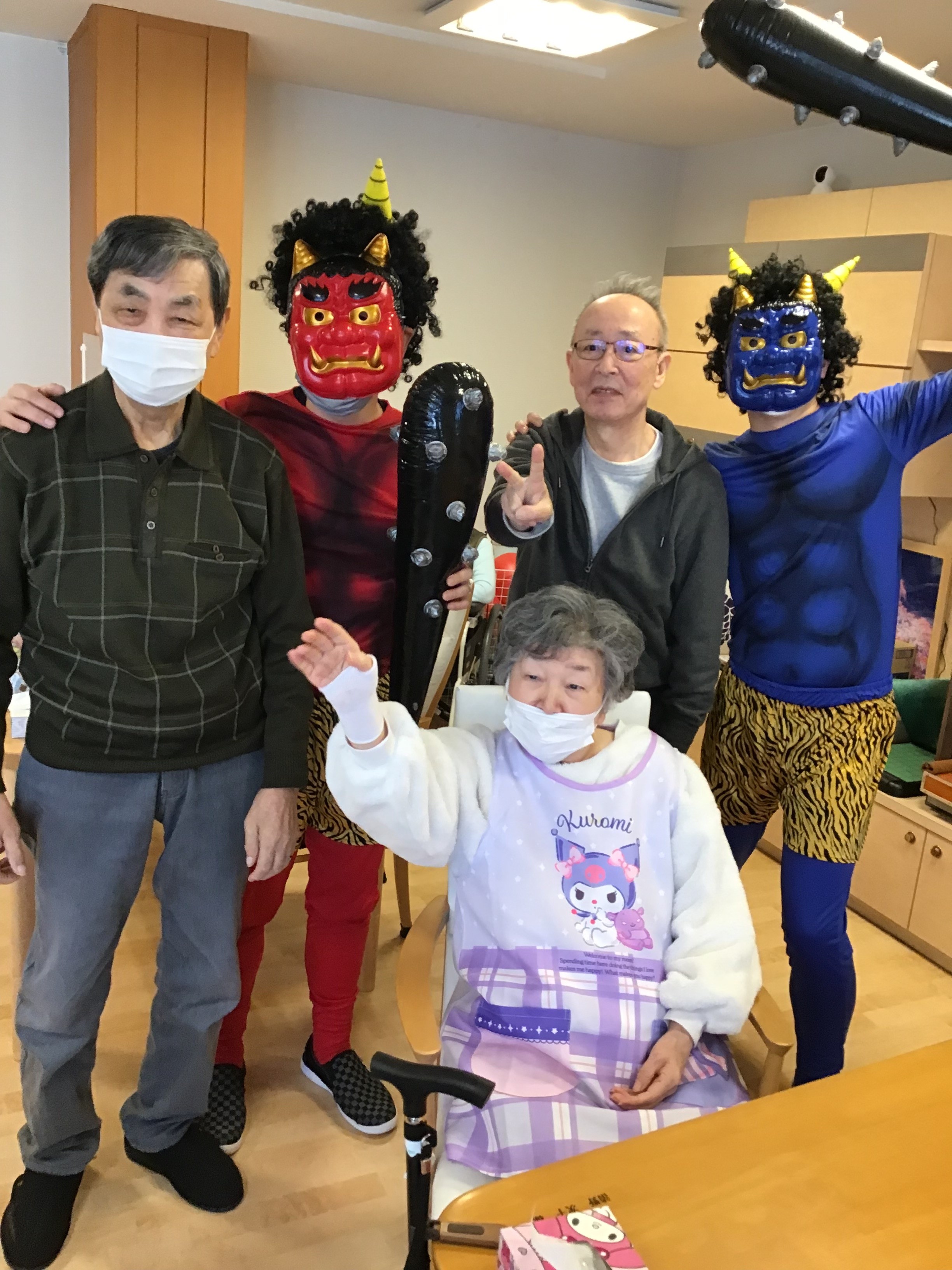 本気で鬼を退治しに来る入居者様がいたり、鬼に怯えている入居者様がいたり、鬼の正体が気になって仕方ない入居者様がいたり、カメラマンを攻撃してくる入居者様がいたり大盛り上がりの時間でした。
